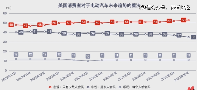更要命的是,越來越多的美國消費者開始不青睞電車。根據虎嗅數據,美國只有11%的消費者對新能源汽車持樂觀態度,認為每個人都會買,有高達53%的消費者吃悲觀態度,認為少數人才會買電動車,剩下的中立態度用戶也越來越多的轉變為悲觀態度。