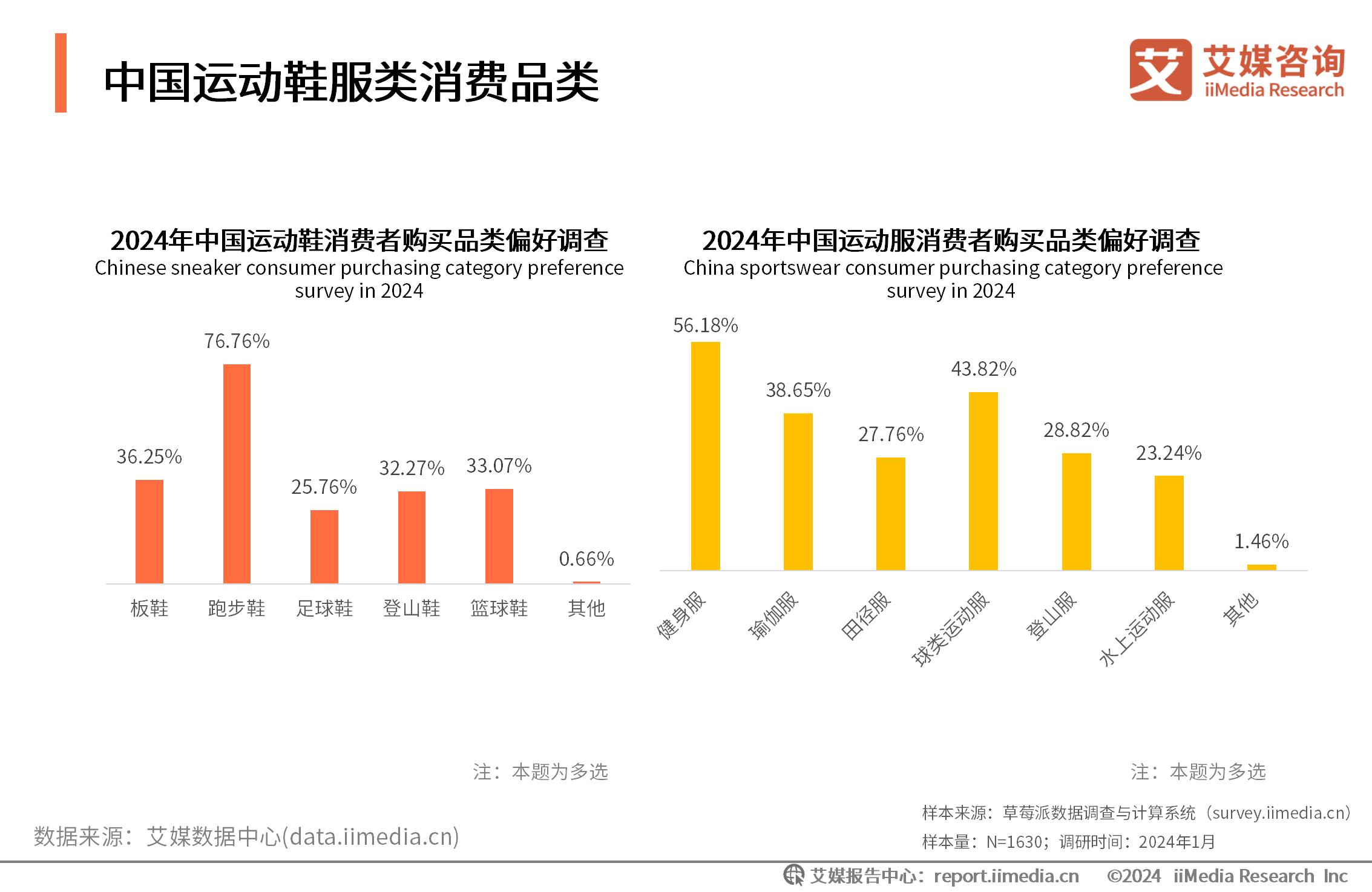 iiMedia Research(艾媒咨詢)數(shù)據(jù)顯示,中國(guó)運(yùn)動(dòng)鞋市場(chǎng)中跑步鞋最受歡迎,消費(fèi)者對(duì)板鞋、籃球鞋和登山鞋的選擇結(jié)果無太大差別。消費(fèi)者購買的運(yùn)動(dòng)服品類中,健身服占比最高,為56.18%;其次是球類運(yùn)動(dòng)服,占比43.82%。