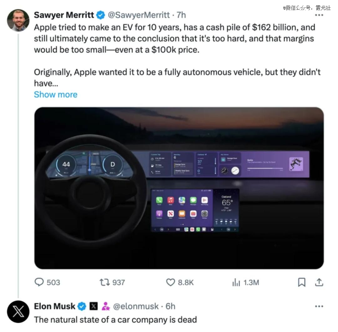 而蘋果放棄造車,“利益+夢想”這對衡量得失的組合“如影隨形”。知名電車分析師索耶·梅瑞特則在社交平臺發文認為,蘋果用了10年時間嘗試制造電動汽車,擁有1620億美元的現金儲備,但最終得出的結論是,這太難了,而且利潤太小——即使定價10萬美元。