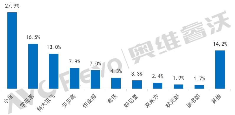 從品牌份額來看,小度以27.9%的份額占據領先位置,學而思和科大訊飛分別以16.5%和13.0%的市場份額緊隨其后,其余品牌市場份額較為分散,市場中存在較多的中小型競爭者,且競爭格局較為多元和復雜。
