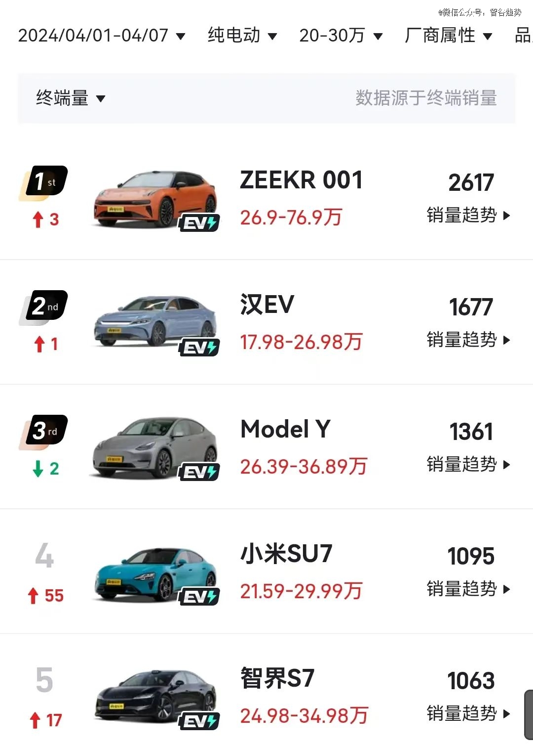 “小米汽車的反圍剿之戰(zhàn)”,易車榜最近盤點(diǎn)了SU7及主要對手的周銷量。