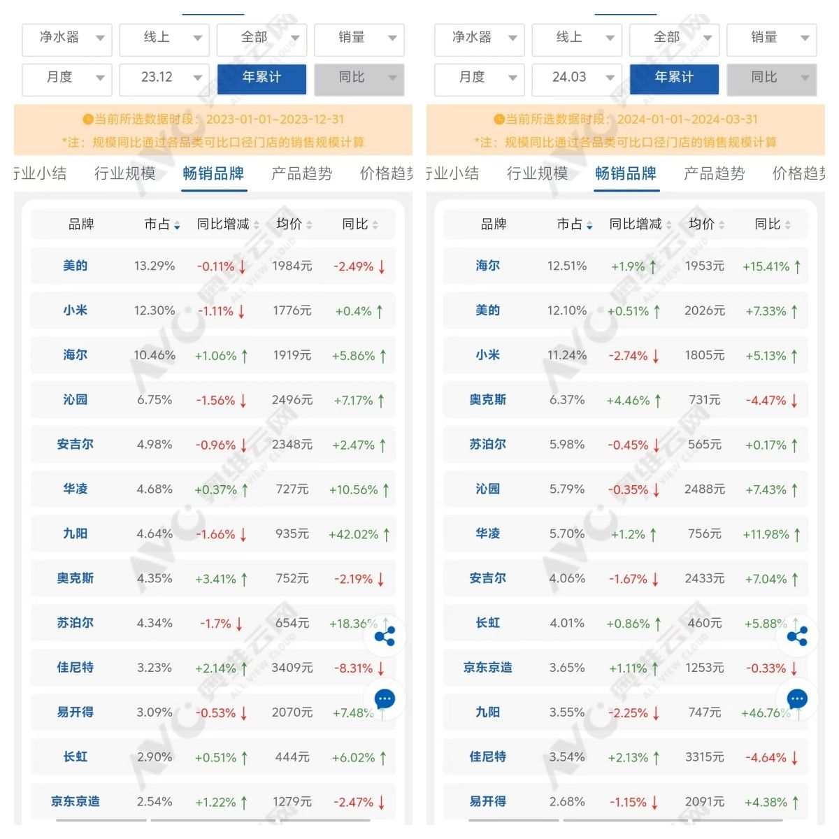 安吉爾,保持第二,2023年銷量份額同減2.9%,至13.72%;與A.O.史密斯和沁園的不同在于,今年一季度,安吉爾止跌回升,同增0.81%,至14.76%。