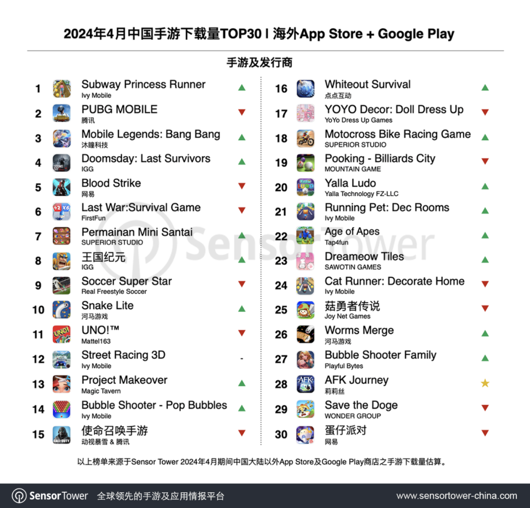 Ivy Mobile《Subway Princess Runner》3月下載量環(huán)比增長(zhǎng)10%,首次問(wèn)鼎下載榜。