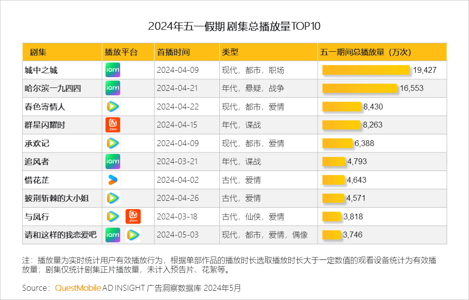 5.2 五一假期劇集播放量方面,四大長(zhǎng)視頻平臺(tái)均有劇集上榜,題材豐富多元,其中,愛(ài)奇藝兩部熱播劇,五天總播放量破億