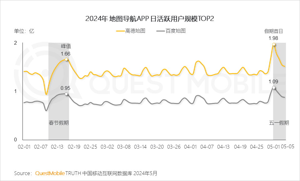1.5 從地圖導(dǎo)航平臺(tái)來(lái)看,5月1日高德地圖APP活躍用戶激增至近兩億,百度地圖DAU超一億