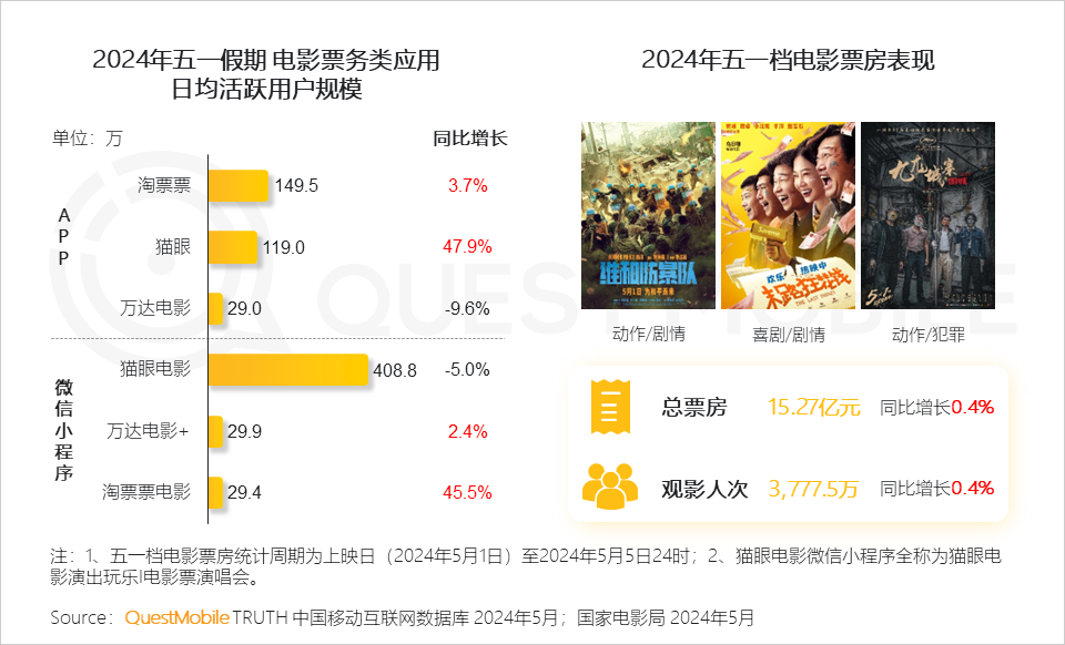 3.3 2024年電影行業(yè)延續(xù)復(fù)蘇趨勢(shì),盡管五一檔期未能迎來(lái)極為突出的頭部大片,但多類型影片的百花齊放,共同撐起整體票房