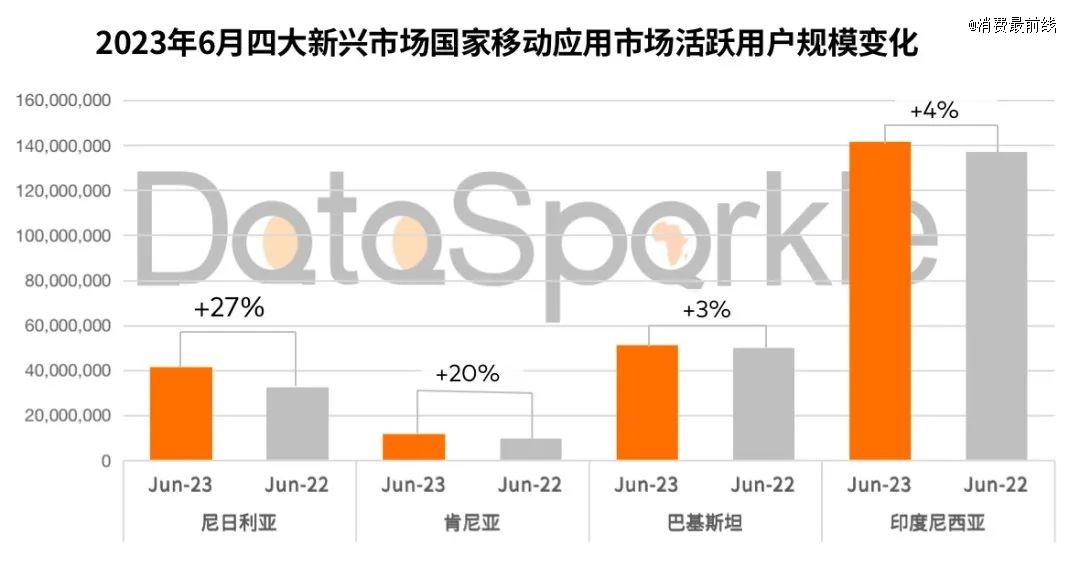 而是中東、東南亞、非洲以及加勒比海和拉丁美洲……這些新興地區。尤其是非洲,根據 DataSparkle 數據,非洲國家是當前移動應用市場最為快速發展的地區之一,尼日利亞和肯尼亞移動應用活躍用戶數量同比增長超 20%。