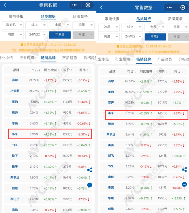那么,現在小米冰箱、洗衣機業務在行業里的地位如何呢?奧維云網數據顯示,2024年1月1日-6月2日,線上銷量來看,小米冰箱市占率為6.2%,同比增長2.55%,排名第4;小米洗衣機市占率為3.98%,同比增長1.32%,排名第6。