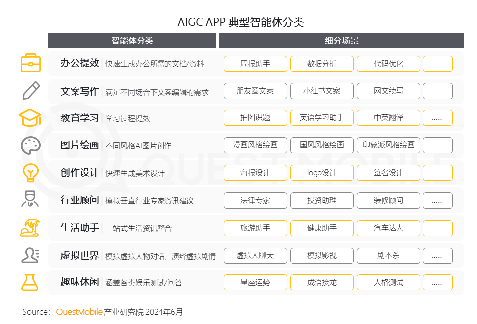 2、雖說各家對智能體的分類及命名稍有不同,但教育學(xué)習(xí)、社交/娛樂、職場辦公是共同聚焦場景