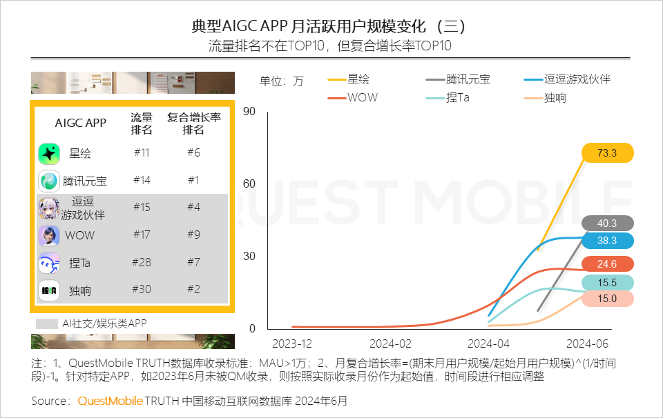 QuestMobile數(shù)據(jù)顯示,2023年6月至2024年6月,復(fù)合增長率在50%以上的APP共有12個,10%-50%的17個,0-10%的15個。