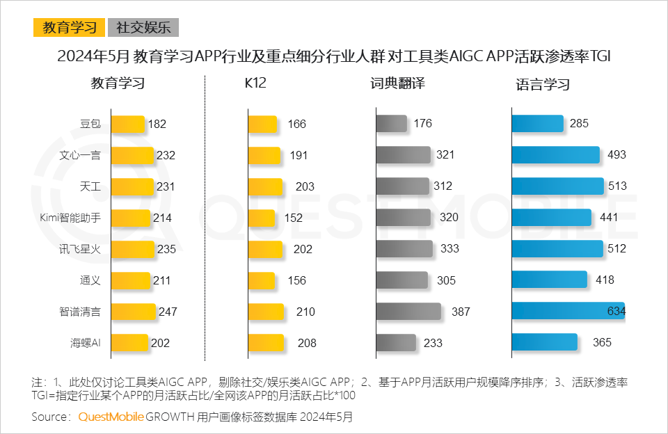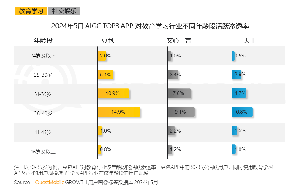 QuestMobile數(shù)據(jù)顯示,豆包、文心一言、天工在24歲及以下有著教育學(xué)習(xí)需求的人群中的滲透率不足,分別為2.6%、1.0%、0.5%。