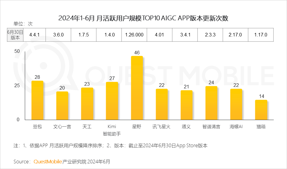 據(jù)公開資料顯示,星野在2024年上半年進行了多達46次的版本更新,其次是豆包和Kimi智能助手。