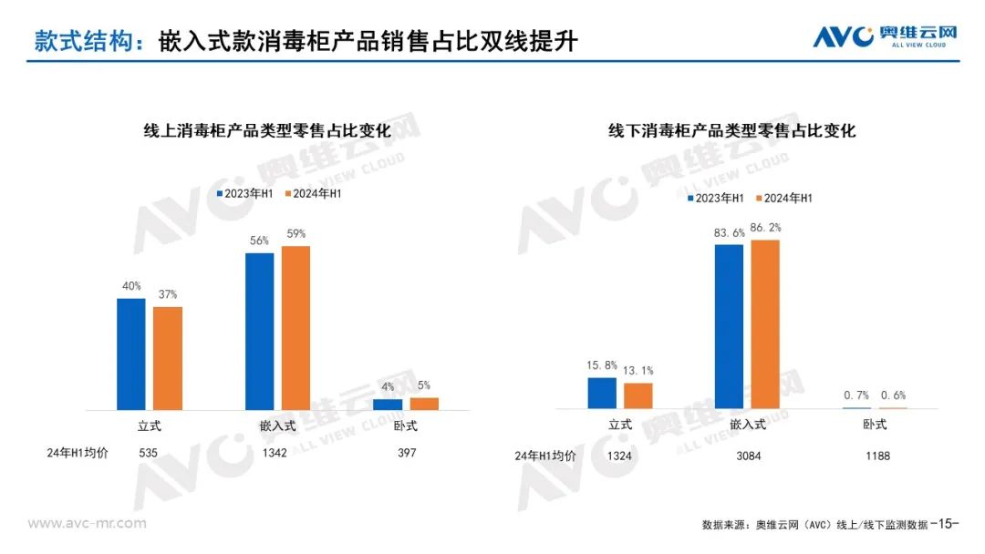 從新品布局來看:2024年消毒柜線上市場新品數量92款,零售額6千萬,新品銷售規模占比提升2.36%。線下市場新品數量62款,零售額134萬,新品銷售規模占比減少1%。線上新品以立式款為主,新品占比68%.線下新品以嵌入式款為主,新品占比74.19%。從上市新品來看,產品更注重安全及聚焦母嬰群體。