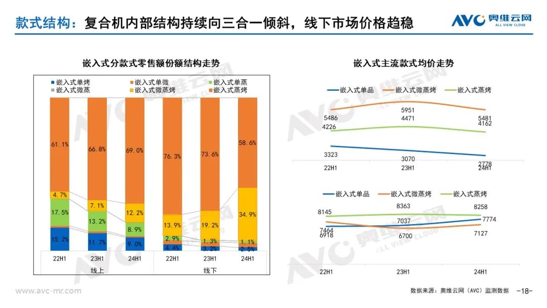 從產品結構看:復合型三合一產品滲透加速,線上市場開始“內卷”價格。分類型看,根據奧維云網(AVC)監測數據,2024年上半年線上市場嵌入式蒸烤產品零售額占比69%,較同期增長2.2%;線下市場嵌入式蒸烤產品零售額占比58.6%,較同期減少15%;嵌入式微蒸烤復合產品滲透加速,據奧維云網(AVC)監測數據,2024年上半年線上市場嵌入式微蒸烤復合產品零售額占比12.2%,較同期增長5.1%。線下市場嵌入式微蒸烤復合產品零售額占比34.9%,較同期增長15.7%。嵌入式單功能產品零售額份額占比進一步收窄,短期內仍處于下滑區間。