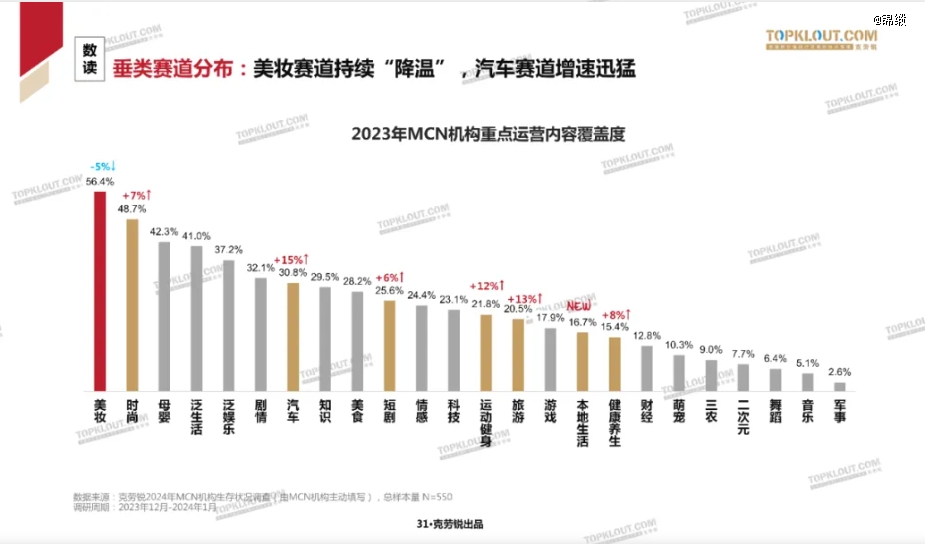 發展至今,市場變化和實際運營效果分化,MCN機構對美妝的關注度開始有所下降。近期,國內權威自媒體價值排行第三方數據監測機構克勞銳發布了《2024年MCN機構生存狀況調查報告》。