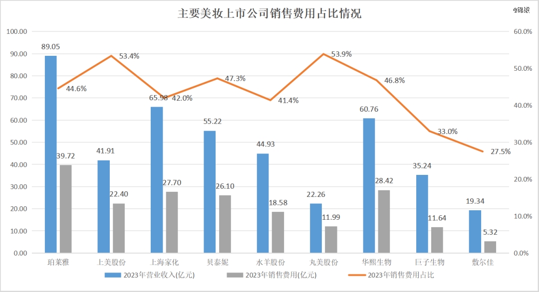 如此蓬勃的行業發展,也給相關上下游提供了充裕的紅利機會。在美妝企業中,營銷是主要業績驅動力,營銷費用占比一直是*的成本支出。
