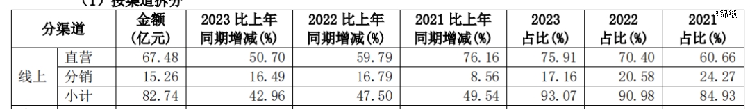 根據年報顯示,2023年珀萊雅營業收入 89.05 億元,同比增長 39.45%。按渠道分類,線上渠道營業收入高達82.74億元,比上年同期增加42.96%,占營業比為93.07%,呈逐年猛增態勢。