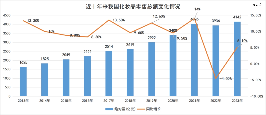 根據國家統計局數字顯示,2023年我國化妝品零售總額為4142億元,較2013年的1625億元增長了155%。