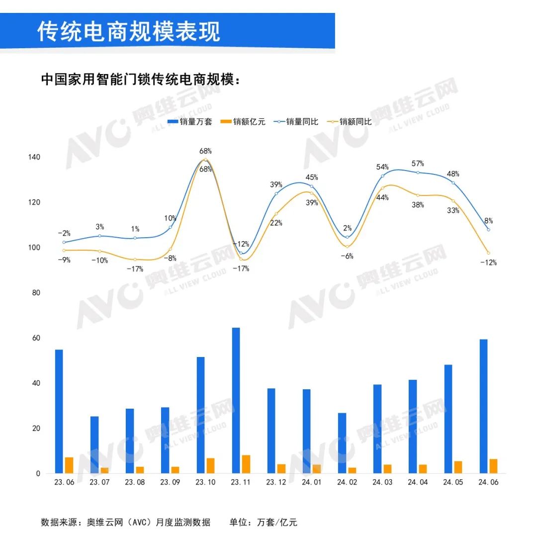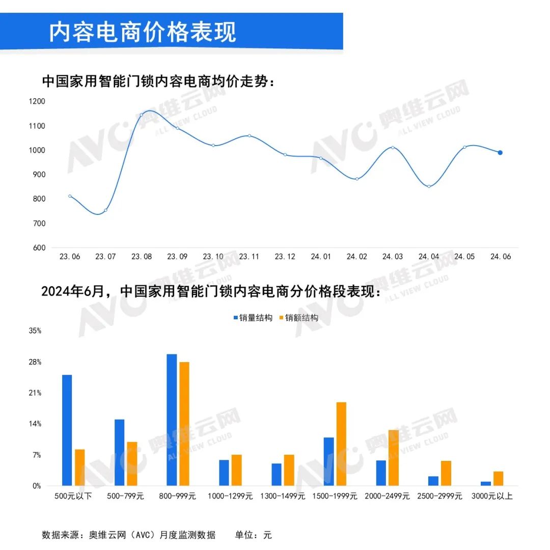 奧維云網(AVC)《2024年6月中國家用智能門鎖線上市場總結報告》顯示,6月中國家用智能門鎖線上市場整體零售量規模同比增長14%,零售額規模同比下降1%。進入2024年以來,智能門鎖分月度線上市場整體零售額規模首次出現同比下滑,這一變化受到了兩個主要因素的影響:首先是“618”年中大促活動的時間提前,其次是線上市場促銷均價的下調。6月,電商平臺呈現出不同的趨勢。傳統電商表現相對疲軟,其零售量規模同比增長8%,零售額的降幅較為明顯,同比下降12%,且均價同比、環比均有下調。而內容電商平臺則在6月呈現出積極的增長態勢,零售量規模同比增長33%,零售額規模同比增長67%。