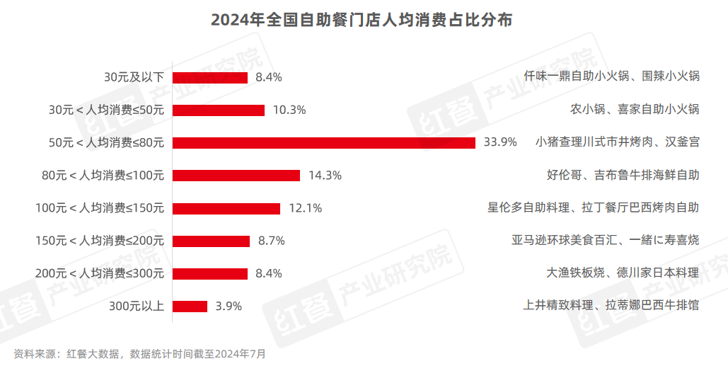 由于自助餐涵蓋了眾多品類,品牌定位也不盡相同,因此,其人均消費呈現出較大的跨度,既有30元以下的親民價位,也有超過300元的高端選擇,可滿足不同消費者的需求。