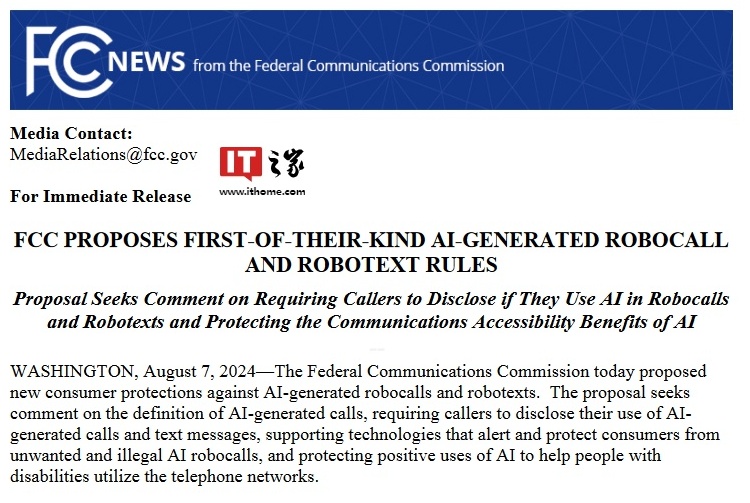 美國聯邦通信委員會(FCC)公布了新的提案,希望規范 AI 生成的電話和短信,明確其定義并構建完善的消費者保護機制,并要求運營公司披露關于在電話和短信服務中使用 AI 的報告。