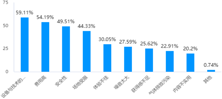 調研發現,設備與技術的成熟度、費用高、安全性、場地受限是教育培訓場景下消費者最大的顧慮因素。