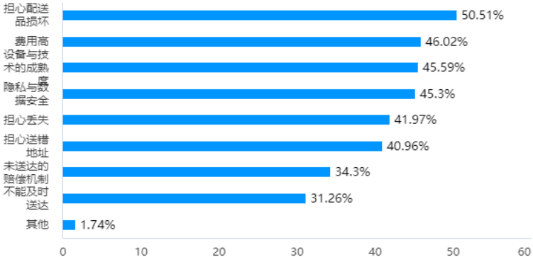 調研發現,擔心配送品損壞、費用高、設備與技術的成熟度、隱私與數據安全是外賣快遞場景下消費者最大的顧慮因素。