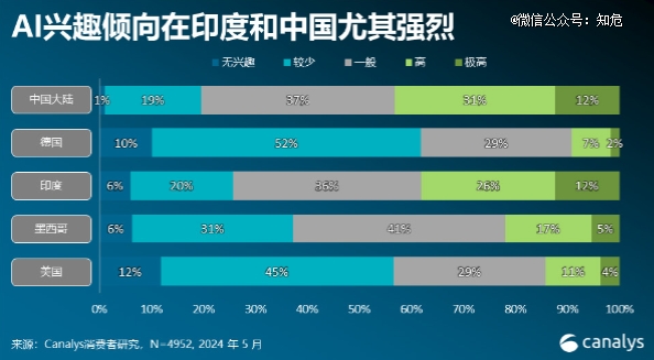 更對 iPhone 16 不利的一個數據是,從具體的地域分布來看,消費者對 AI 手機最感興趣占比較高的地區是中國大陸和印度,而美國消費者則是僅有合計 15% 的群體對 AI 功能感興趣,無興趣、興趣較少、興趣一般的消費者則是合計高達 85% 。