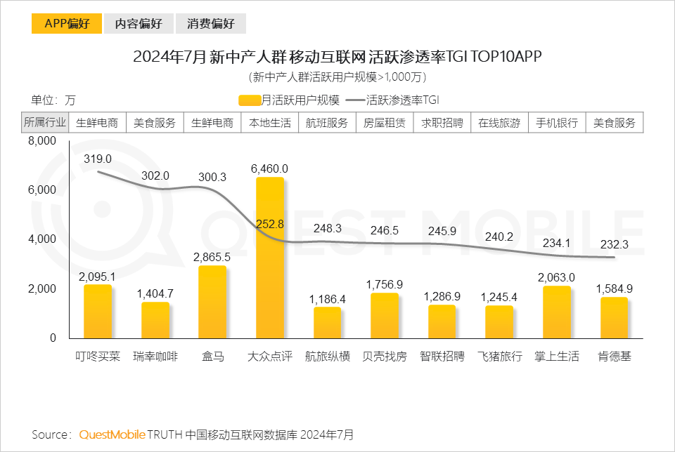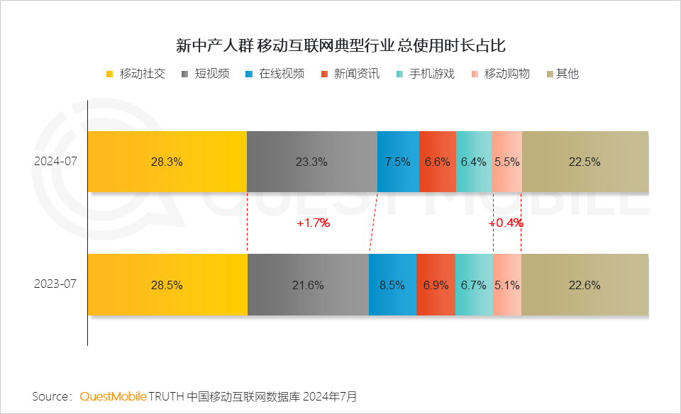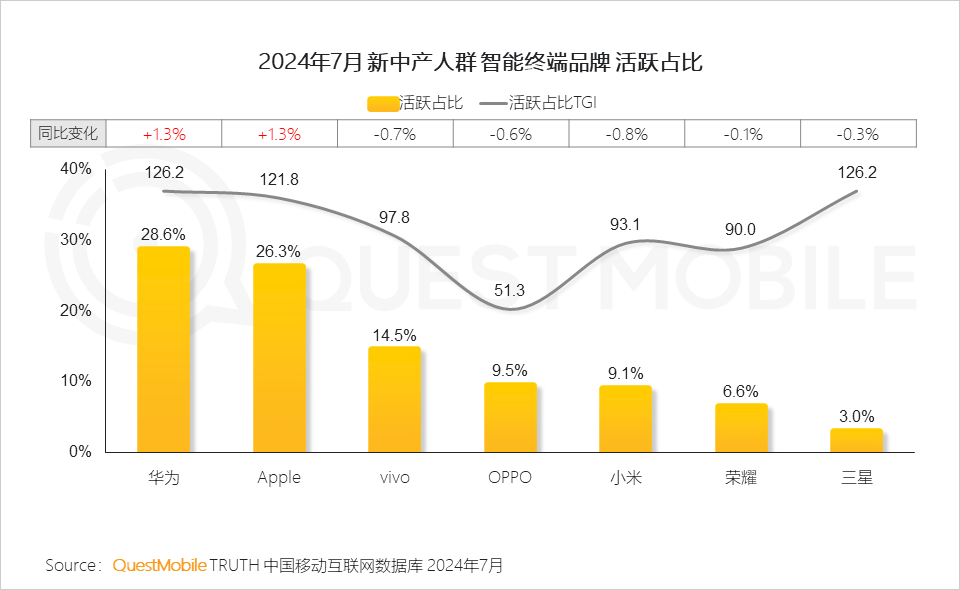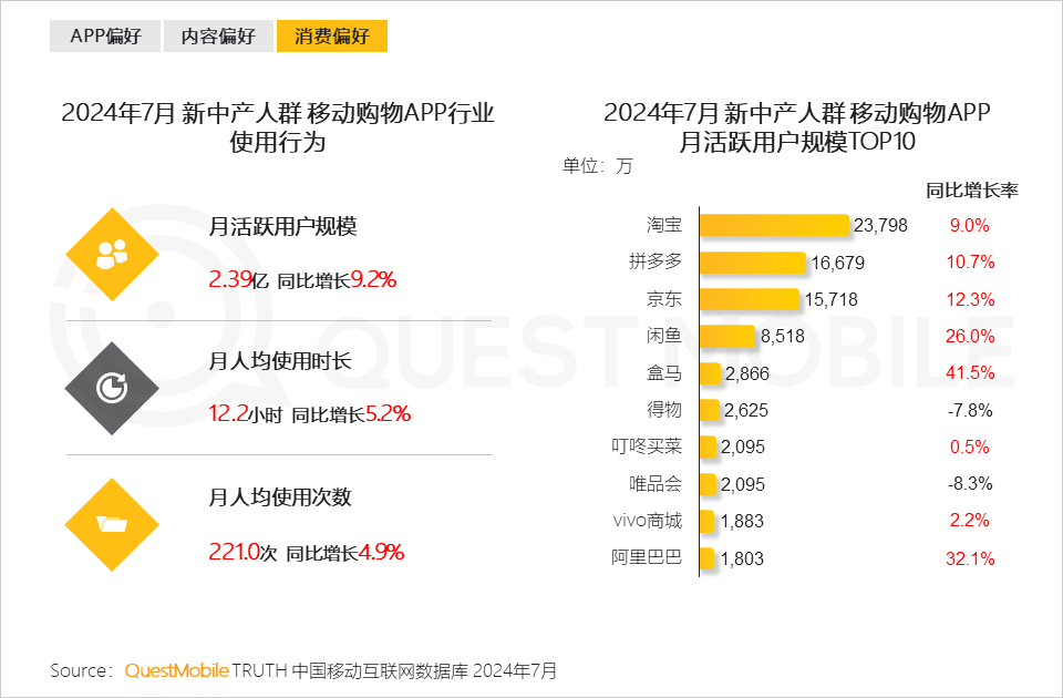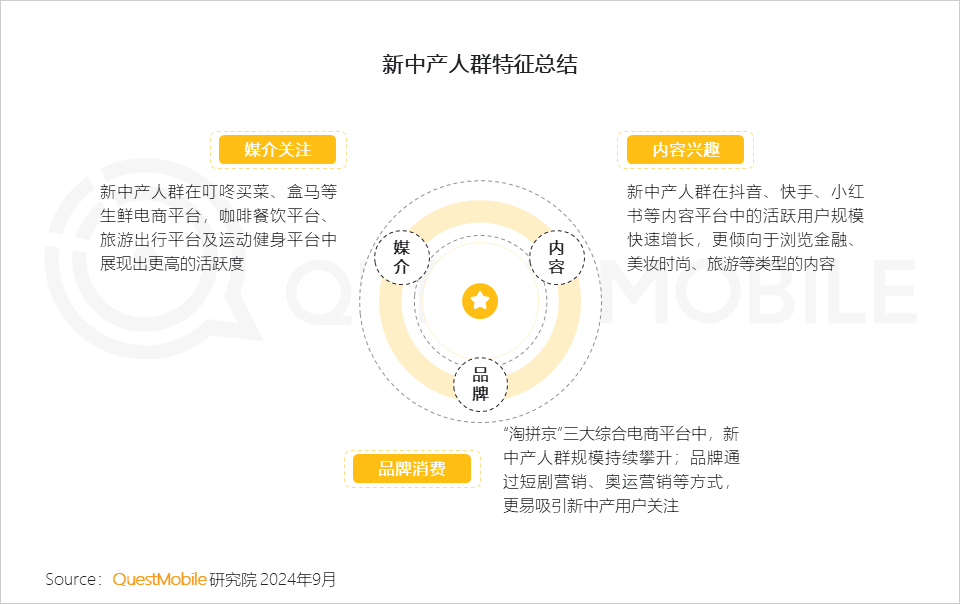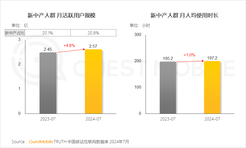 QuestMobile數據顯示,新中產人群的全網占比持續提升,2024年7月用戶規模達到2.57億,同比增長4.8%。