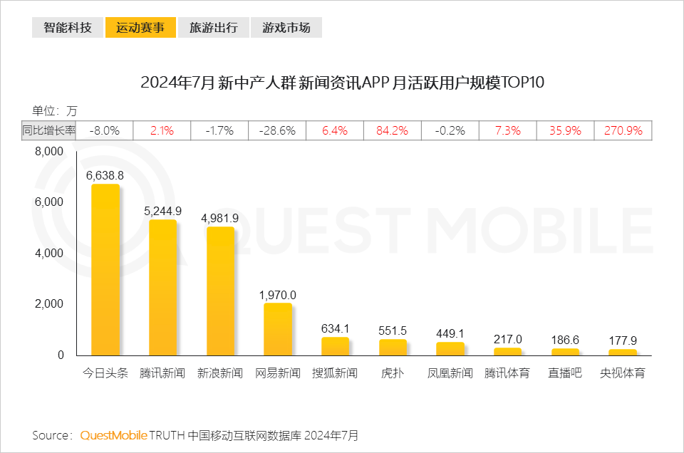7、同時,新中產也通過各類新聞資訊平臺,尤其是垂直體育資訊平臺關注賽況,虎撲、央視體育APP流量顯著增長