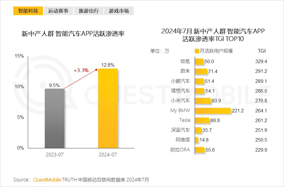 3、新中產人群在智能汽車行業中的活躍滲透率不斷提升,極氪、蔚來、小鵬等新勢力品牌成為其首要選擇