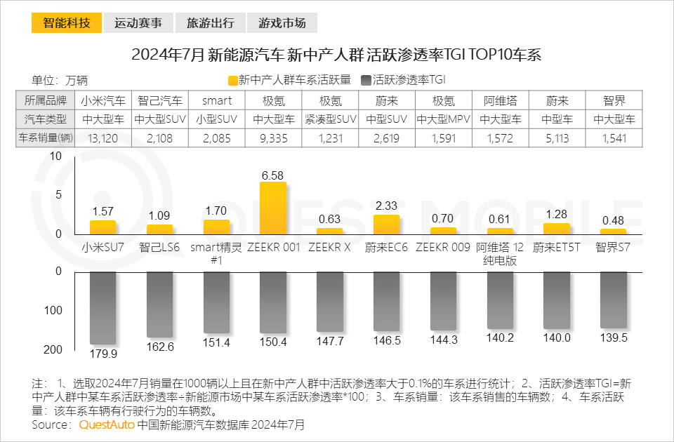 QuestAuto數據顯示, 新中產人群在新能源汽車選擇上更偏好小米SU7、智己LS6等熱門車系。
