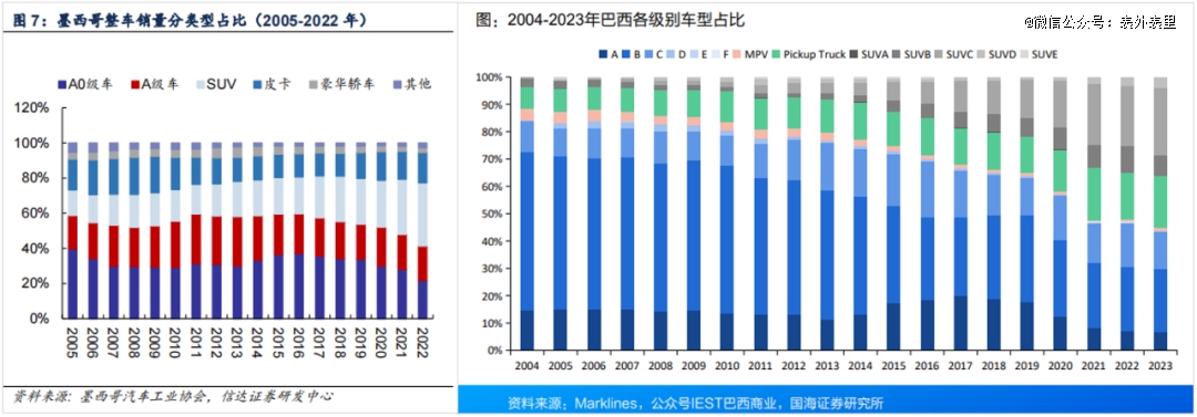 這看起來與海外市場的行情有些出入——拉美、東南亞、中亞等國內汽車重點出口區域,都是小型車當道,拉美直到2023年低端微型和緊湊型轎車占比仍超40%。