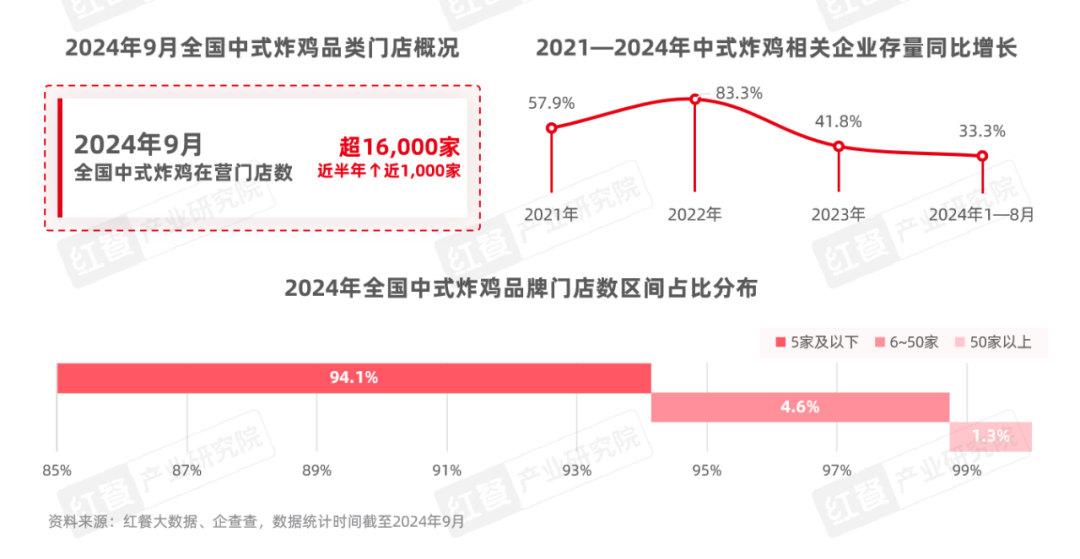 與此同時,中式炸雞門店數獲得了持續增長。據紅餐大數據,截至2024年9月,全國中式炸雞門店數超過1.6萬家,近半年增長近1,000家。