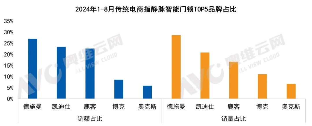 靜脈識別技術在智能門鎖領域的應用,指靜脈比掌靜脈更早的進入市場,市場成熟度相對較高。奧維云網(AVC)線上監測數據顯示,2024年1-8月傳統電商指靜脈智能門鎖零售額占比為10%,零售量占比為7%,市場表現更加亮眼。在指靜脈識別賽道的品牌競爭格局方面,頭部品牌處于主導地位。2024年1-8月傳統電商指靜脈智能門鎖的TOP5品牌合計零售額占比達到88%,合計零售量占比達到84%。其中,德施曼品牌顯示出了強大的市場競爭力,占據零售額和零售量的第一位置。凱迪仕與鹿客分別排在第二位和第三位。
