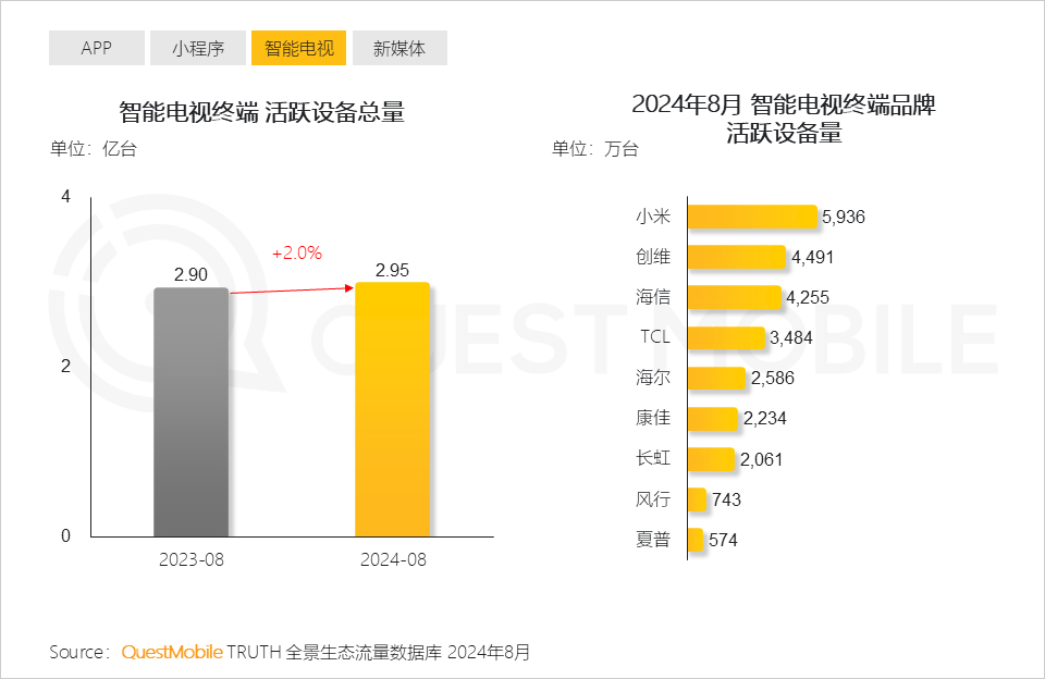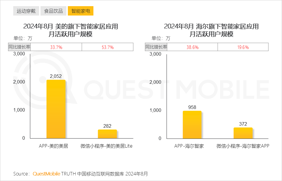 QuestMobile數據顯示,2024年8月,美的、海爾、聯想品牌去重用戶規模位列前三。