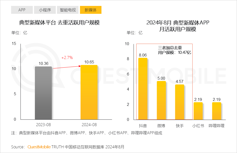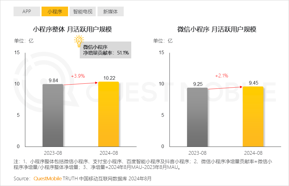 QuestMobile數據顯示,2024年8月小程序整體月活躍用戶規模同比增長3.9%,達10.22億。