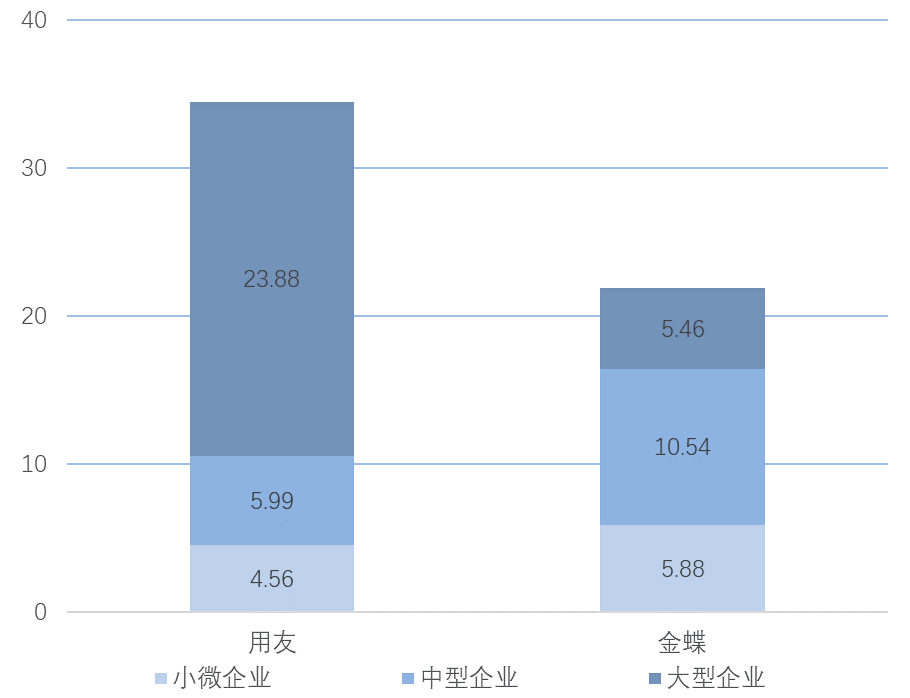 今年上半年,用友來自大型企業的收入占比高達69.3%,是最重要的板塊;來自中型企業的收入占比17.4%;來自小微企業的收入最少,但整體增速卻最快,幾年內就會追上中型企業的收入;金蝶對企業客戶為中小微企業為主,營收分別是10.54億元和5.88億元、兼顧突破大型企業只有5.46億元、(人民幣,下同)。