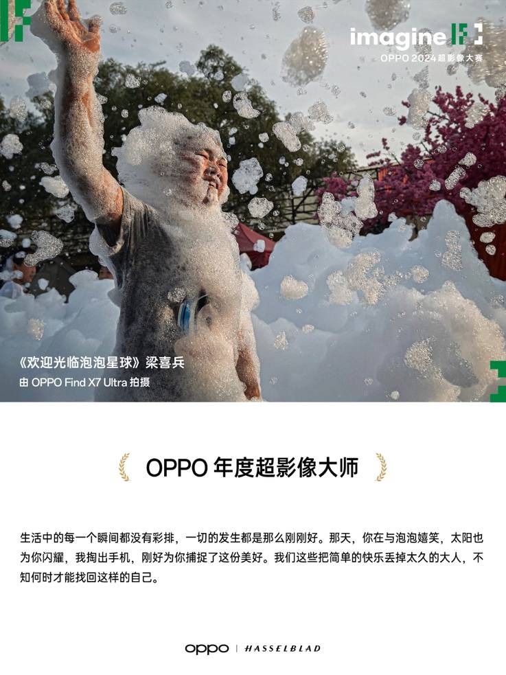 由攝影師梁喜兵拍攝的《歡迎光臨泡泡星球》最終獲得2024 OPPO年度超影像大師獎項。該幅作品中,少年展示出孩子在泡泡中嬉戲的童趣故事。在OPPO Find X7 Ultra鏡頭下,呈現了最本真的童年幸福感。