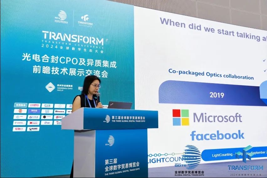 27號上午大會首先亮相的重磅演講嘉賓由來自國際知名專業機構Lightcounting,分析師,曹麗女士以《CPO的發展與趨勢分析》為主題進行精彩剖析。她首先回顧了CPO提出的目標和發展的情況,CPO提出的初衷主要是降低功耗,目標是超過30%,從這個方面看是達到了目標,并且這幾年CPO技術也一直在進步。但是由于客戶對可靠性和可維護性等問題的擔心,以及可插拔技術路線的進步(單通道達到200Gb/s,LPO低功耗方案的提出)CPO的規模商用進程被往后推遲。但是CPO技術路線也沒有放棄進一步努力。以博通為例,它在今年夏天的一次會議上視頻演示了它的CPO生產流程,高度自動化生產和測試流程,有望將CPO的可靠性水平提高到符合期望。