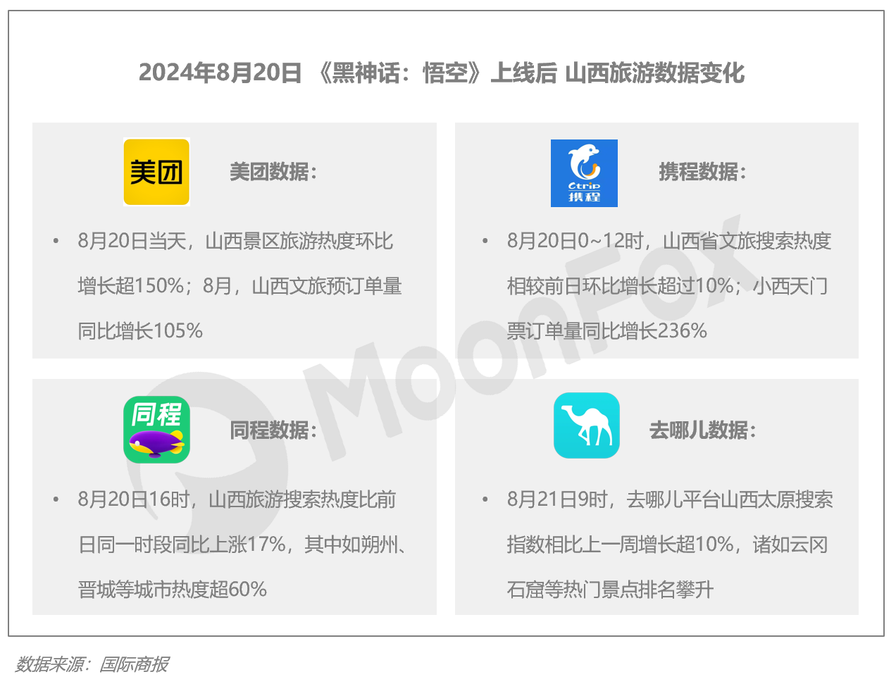 文旅為《黑神話:悟空》推動的主要領(lǐng)域,游戲36個取景地中、27個在山西省內(nèi),云岡石窟、小西天等景點(diǎn)憑借游戲線上熱度攀升。一方面,游戲上線后,宣傳片、游戲?qū)嵕肮_,大量玩家涌入旅游及預(yù)定平臺查詢山西旅游,瀏覽及訂單量迅速走高,全網(wǎng)聲量提升;另一方面,隨著游戲持續(xù)爆火,大量山西官媒發(fā)力內(nèi)容傳播,截至8月底,山西文旅抖音粉絲已超過140萬、小紅書粉絲接近20萬。整體來看,《黑神話:悟空》在為山西文旅帶來龐大流量的同時,讓更多旅客對山西旅游的印象大幅改觀,更多與歷史文化、古韻、國風(fēng)等話題相關(guān)的視頻被發(fā)布,助力山西旅游業(yè)發(fā)展、深化地域形象。