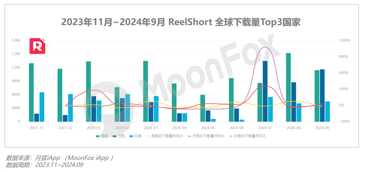 ReelShort于下載、收入維度均排名第二,其于美洲市場表現(xiàn)較為突出。據(jù)月狐數(shù)據(jù),2024年Q3,平臺全球下載共1,875.2萬次、環(huán)比增長一倍以上。美國、巴西為其下載的主要貢獻(xiàn)市場,占比超30%。