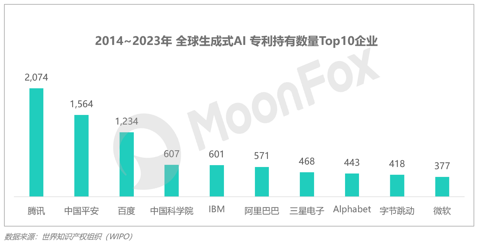 從構(gòu)成來看,頭部互聯(lián)網(wǎng)企業(yè)為專利的主要貢獻(xiàn)方。全球生成式AI專利申請量排名Top10的企業(yè)中,中國企業(yè)占6成,騰訊、平安、百度分別以2,074、1,564、1,234份排名前三。另外,值得一提的是,中國科學(xué)院、清華大學(xué)、浙江大學(xué)分別排名第四、第十五、第十六,我國學(xué)術(shù)機(jī)構(gòu)及高校同樣為生成式AI專利申請的主要主體。
