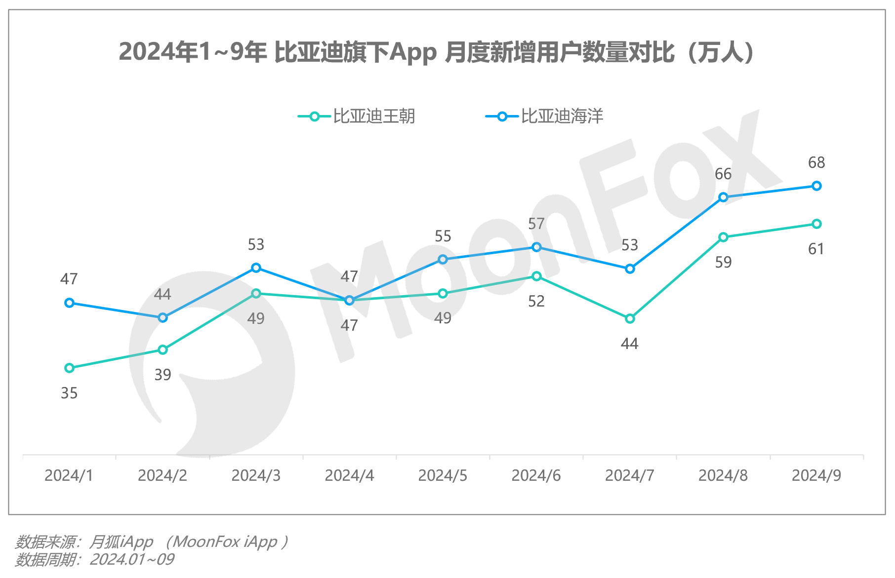 結(jié)合其旗下App新增用戶表現(xiàn),同樣可看出其于近期的銷量提升。據(jù)月狐數(shù)據(jù),2024年7~9月,比亞迪旗下王朝、海洋App分別新增用戶164、187萬人。海洋系列以較低的售價和多樣化的車型吸引更多用戶購買,以9月數(shù)據(jù)為例,其銷量達(dá)到了194,099輛,海洋系列已成為比亞迪銷量增長的重要部分。