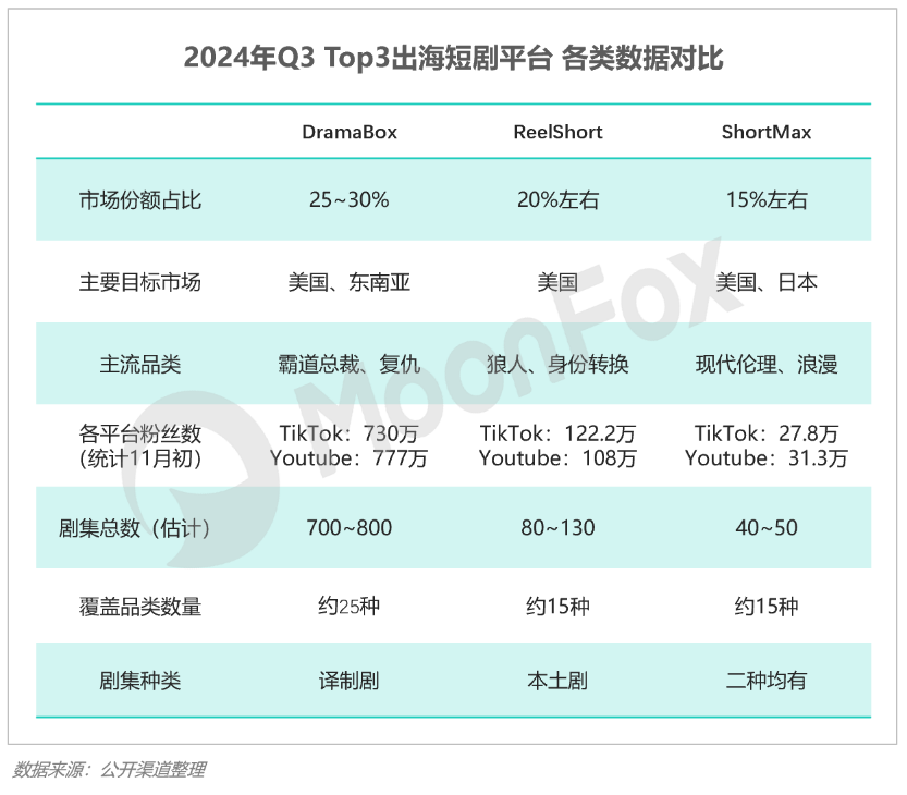 從出海平臺來看,當(dāng)下短劇出海正呈現(xiàn)”三強(qiáng)格局穩(wěn)固、多平臺加速競爭”的趨勢。據(jù)月狐數(shù)據(jù)統(tǒng)計,2024年Q3,DramaBox、ReelShort、ShortMax三者占到短劇出海市場收入份額的約60%,該比例相較上半年有所提升。