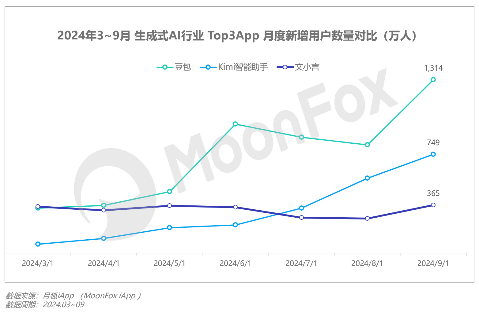 應(yīng)用維度下,豆包、Kimi、文小言為當(dāng)下生成式AI三強(qiáng),其中,豆包增長勢頭顯著。一方面,多功能集成+強(qiáng)趣味性的交互為豆包的核心競爭力,9月初,豆包對音樂生成功能進(jìn)行優(yōu)化、推出音樂模型Seed-Music音樂大模型,當(dāng)下可支持可控音樂生成、譜轉(zhuǎn)曲等功能;9月下旬,豆包視頻生成模型PixelDance與Seaweed正式發(fā)布,支持多鏡頭一致性切換及多拍動作與主體復(fù)雜交互。多項(xiàng)新功能的推出為豆包帶來顯著的用戶增量,據(jù)月狐數(shù)據(jù)顯示,2024年9月,豆包月度新增用戶已突破千萬、環(huán)比大幅增加。