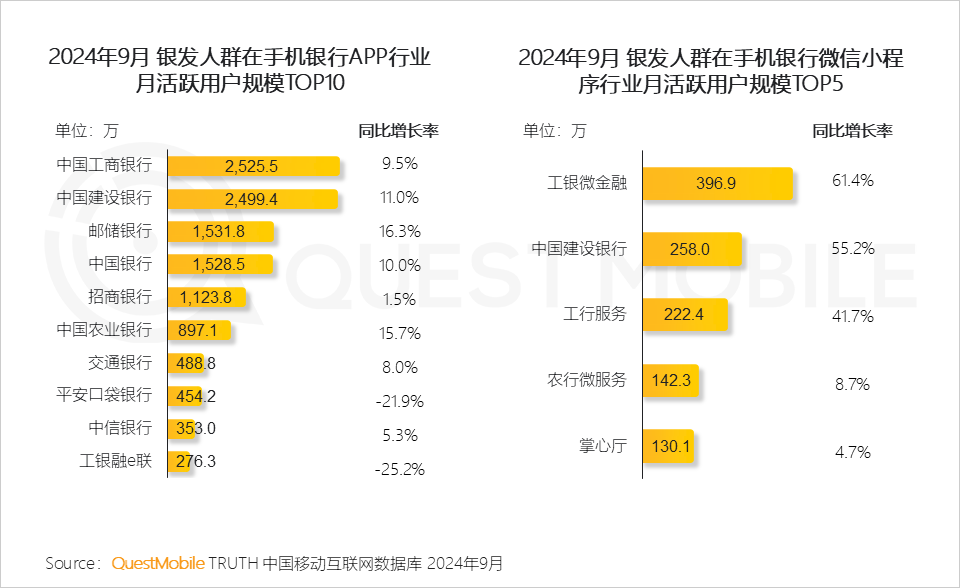 5、銀行類APP適老化改造為銀發人群帶來更好的用戶體驗,用戶規模進一步提升,微信小程序端簡便、快捷化的服務亦吸引了眾多銀發用戶,提升了流量規模