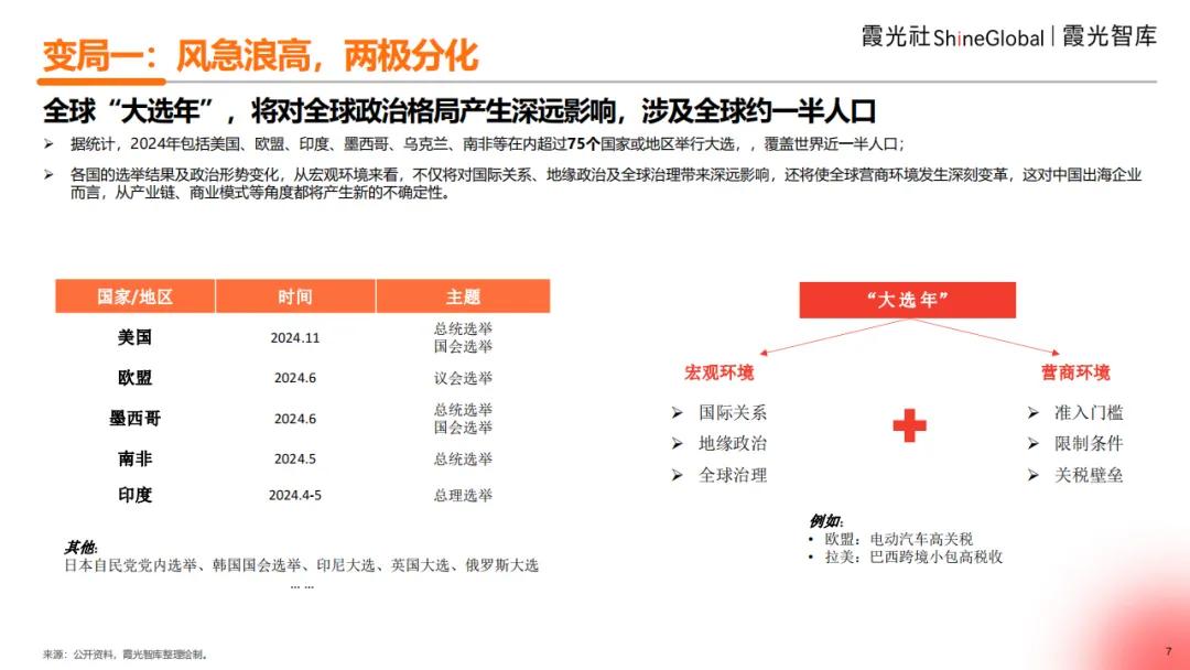 各國的選舉結果及政治形勢變化,從宏觀環境來看,不僅將對國際關系、地緣政治及全球治理帶來深遠影響,還將使全球營商環境發生深刻變革,這對中國出海企業而言,從產業鏈、商業模式等角度都將產生新的不確定性。
