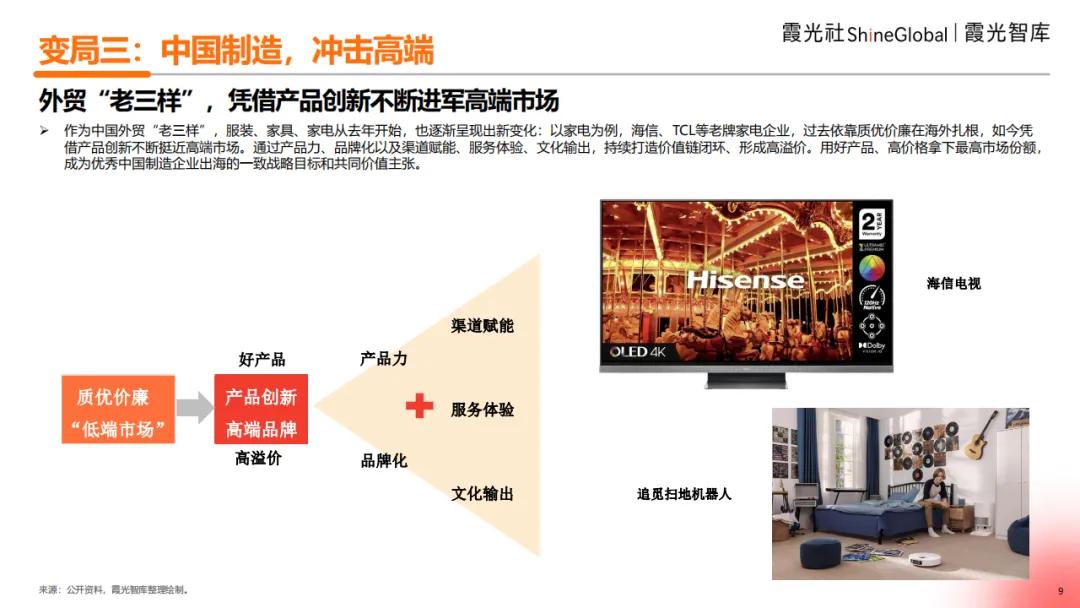 作為中國外貿“老三樣”,服裝、家具、家電從去年開始,也逐漸呈現出新變化:以家電為例,海信、TCL等老牌家電企業,過去依靠質優價廉在海外扎根,如今憑借產品創新不斷挺近高端市場。通過產品力、品牌化以及渠道賦能、服務體驗、文化輸出,持續打造價值鏈閉環、形成高溢價。用好產品、高價格拿下最高市場份額,成為優秀中國制造企業出海的一致戰略目標和共同價值主張。