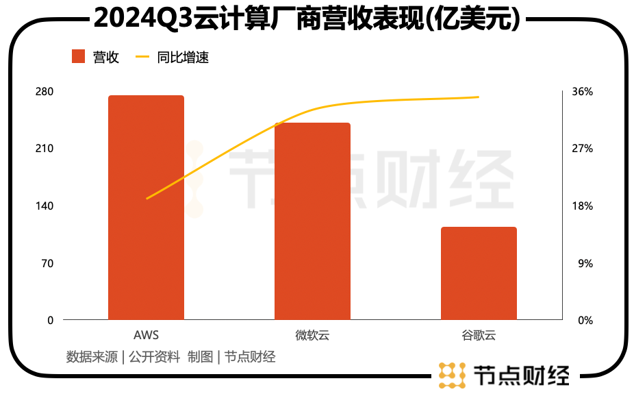 數據顯示,2024年第三季度,AWS實現營收274.52億美元,同比增長19%;同期,微軟云和谷歌云營收分別為240.9億美元、113.5億美元,對應同比增速分別為33%、35%。